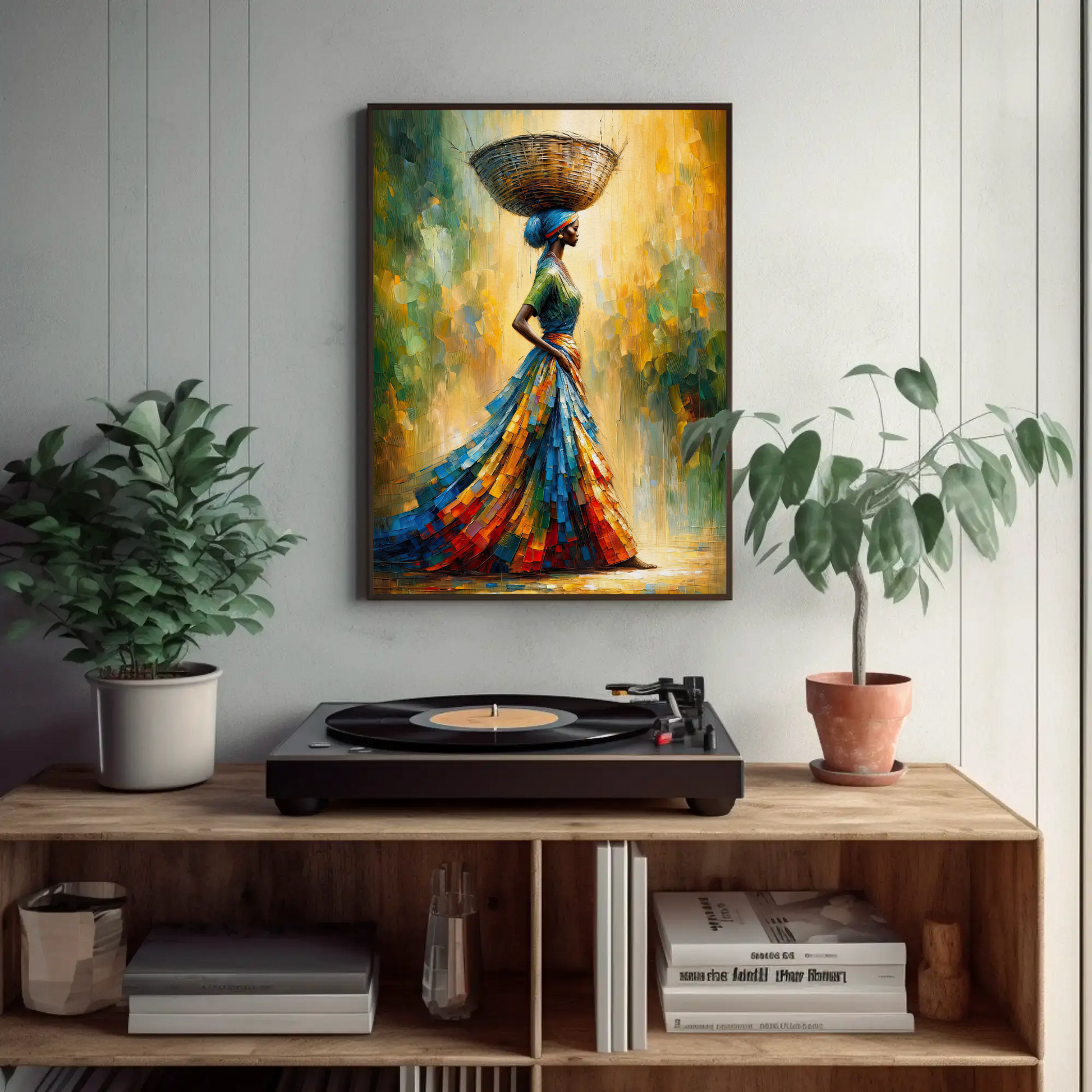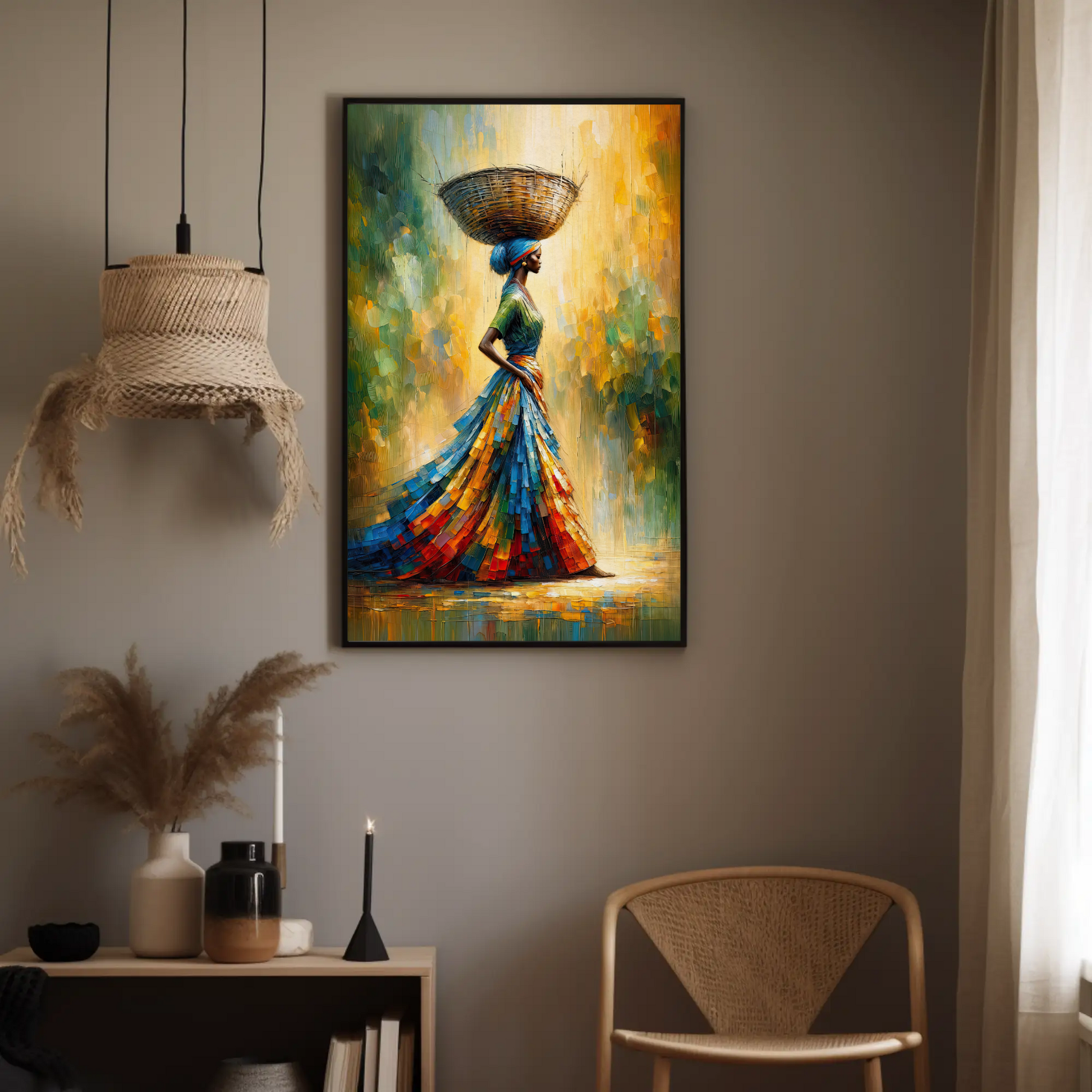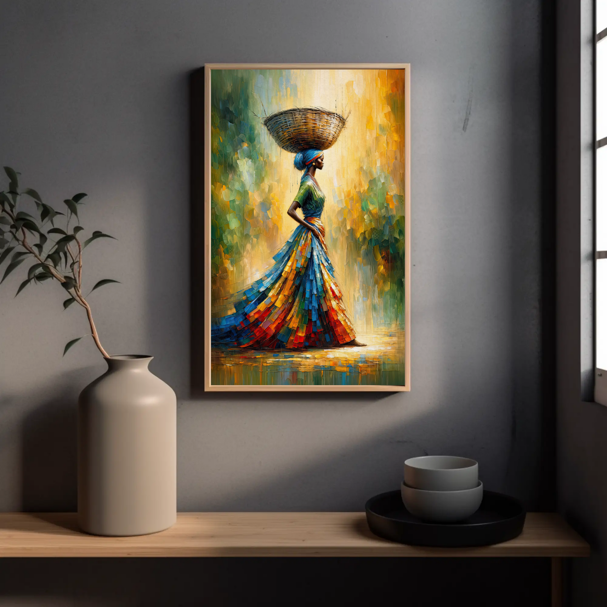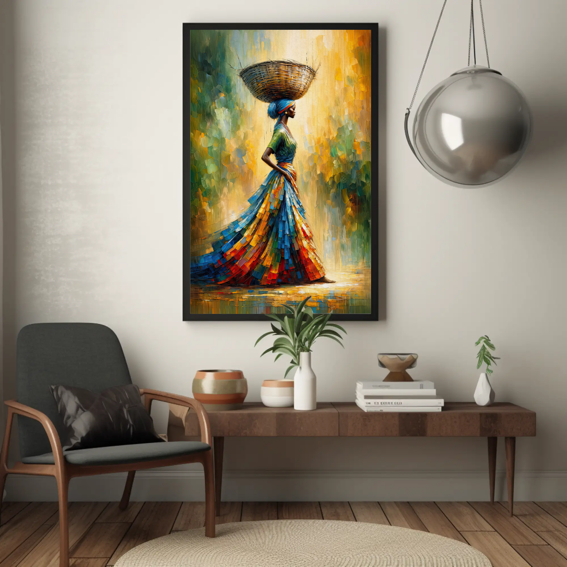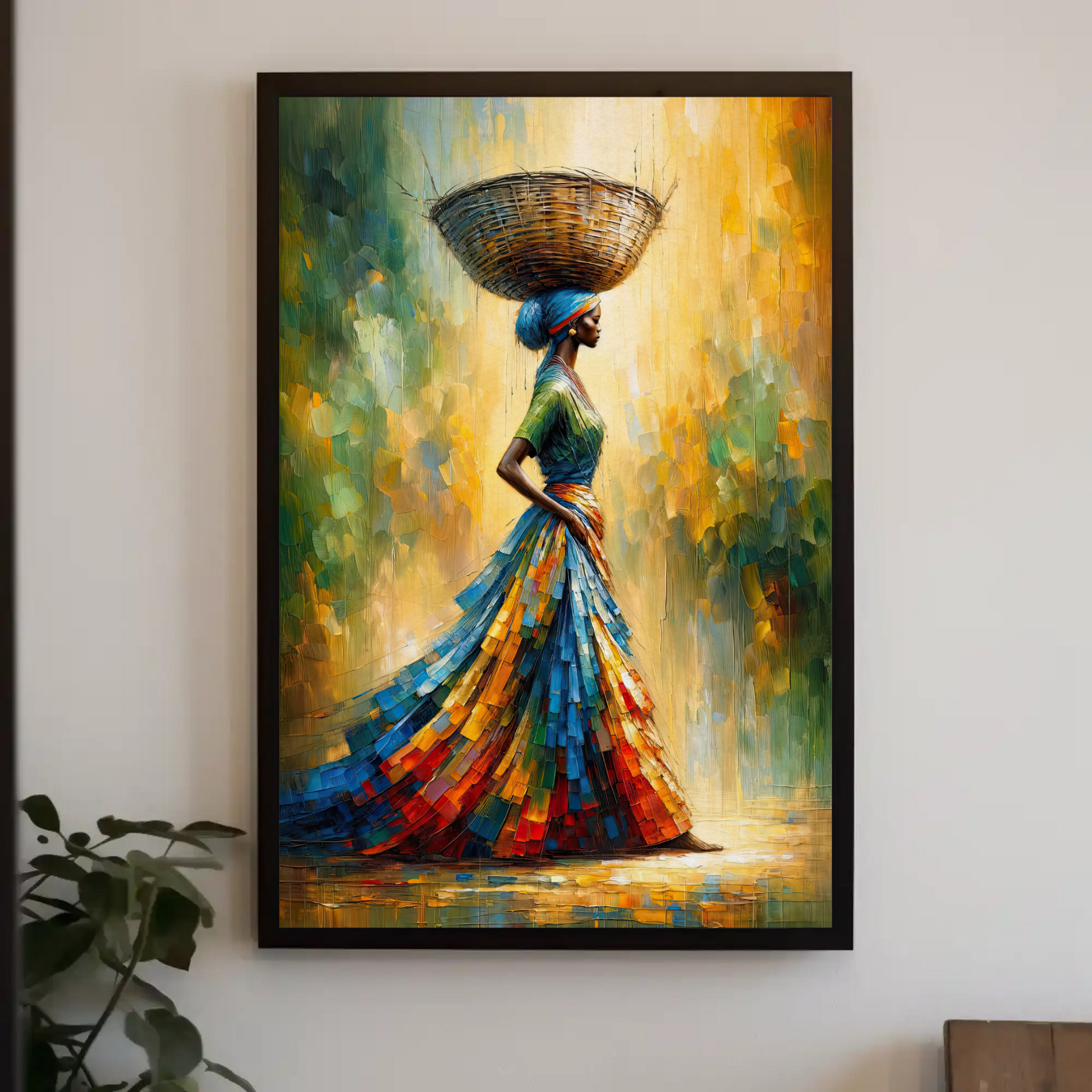 This is an oil painting canvas print featuring an African woman carrying a basket. It is framed and designed as black art, perfect for African American wall decor. This piece of art serves as a beautiful poster showcasing the strength and beauty of Black women.