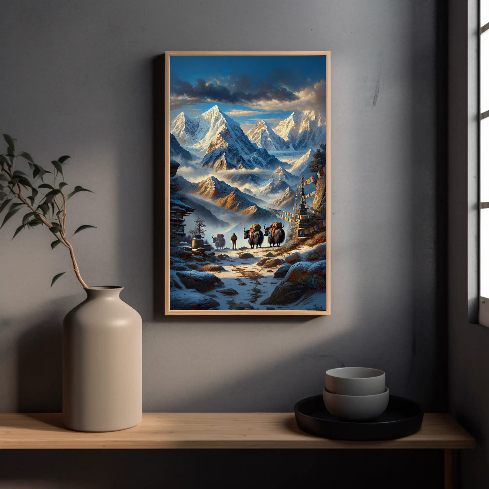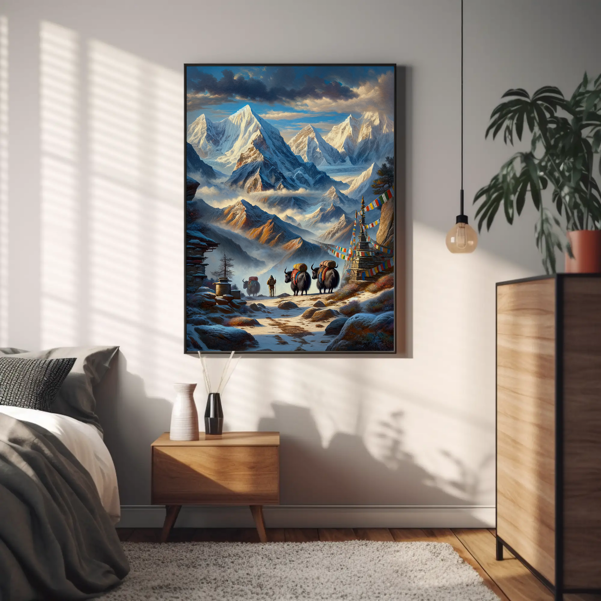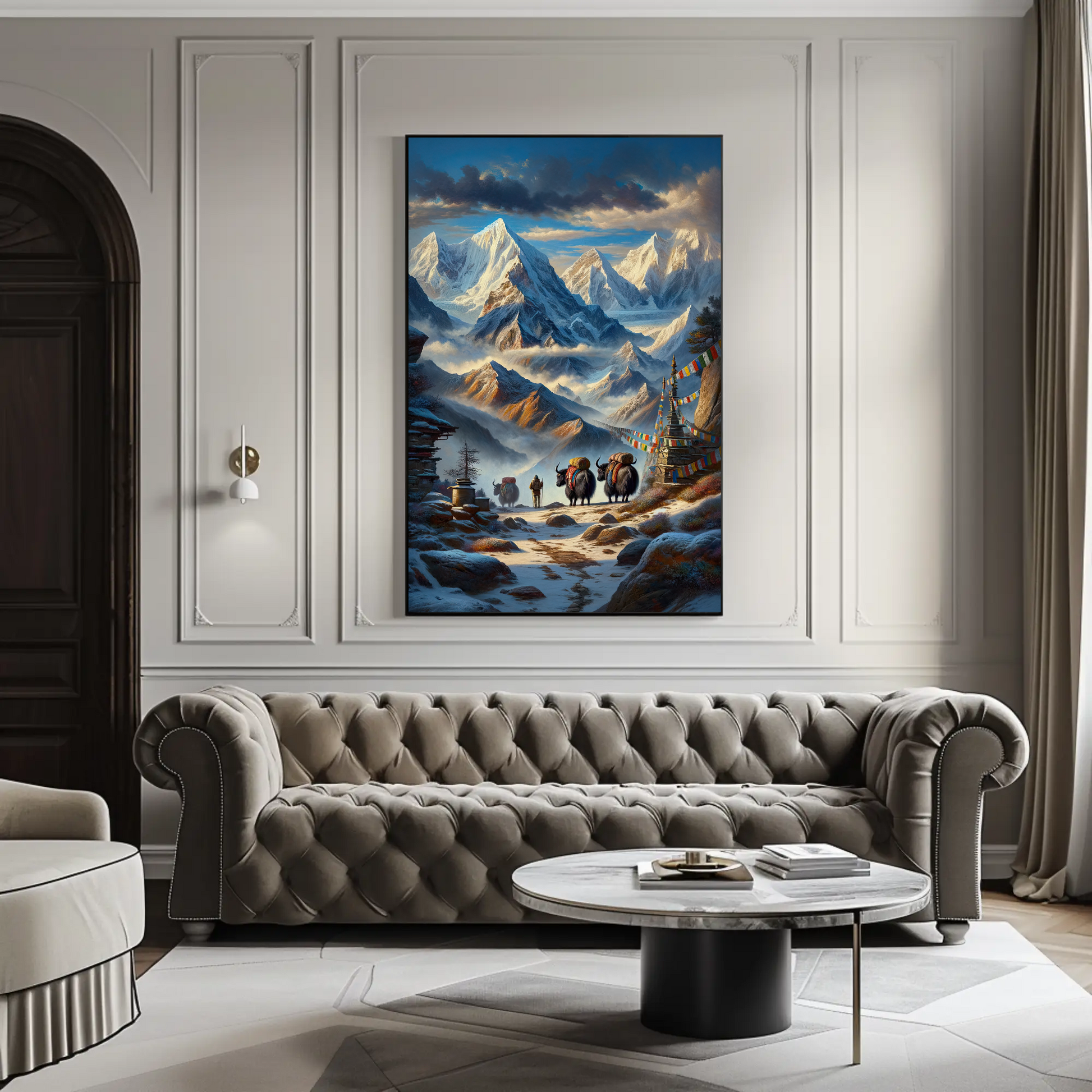 Explore our captivating Himalayan Yaks Painting, a signed canvas art print from India that enhances your living room decor. This exquisite artwork beautifully illustrates the majestic yaks in their natural habitat, bringing a unique and cultural touch to your home. Crafted with high-quality materials, the print showcases vibrant colors that are sure to catch the eye and maintain their appeal over time. This piece not only serves as a striking focal point but also enriches any art collection, making it an ideal choice for those who appreciate the beauty of nature and traditional artistry.