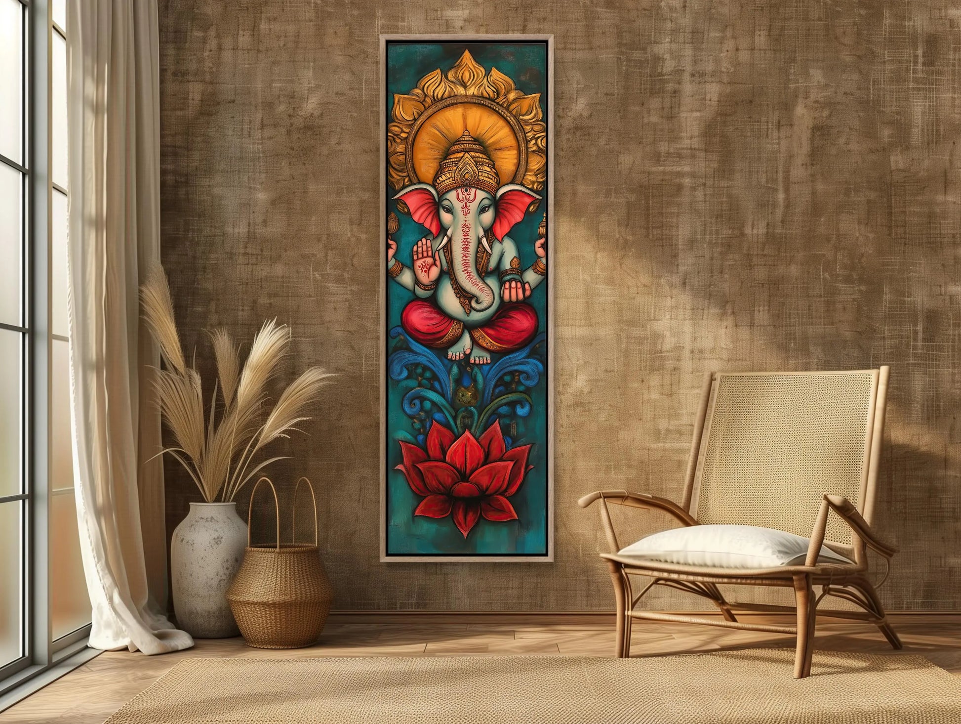 Lord Ganesha Tall Narrow Vertical Canvas Print, Indian Wall Art, Framed Hindu God Decor for Meditation Room or Living Room, Ready to Hang